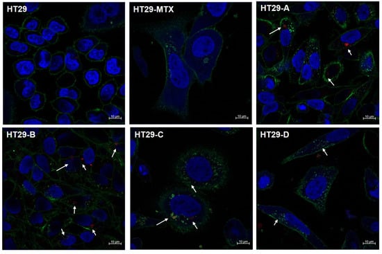 The detection of core 1-derived mucin-type O-glycans and secreted mucins in differentiated HT-29 cells using fluorescent rHEL2a lectin (green), anti-human MUC2/MUC5AC antibodies (red), and DAPI (blue). HT29: untreated negative control; HT29-MTX: methotrexate-stimulated cells (positive control); HT29-A, -B, -C, and -D: HT-29 cells exposed to short-chain fatty acids in bacteria-free supernatant from cultures of in vitro gut microbiome consortia supplemented with H. erinaceus (HT29-A), S. crispa (HT29-B), oats (HT29-C), or barley (HT29-D). The arrows indicate accumulated mucins detected by the mucin antibodies. The images were obtained using a confocal laser microscope.