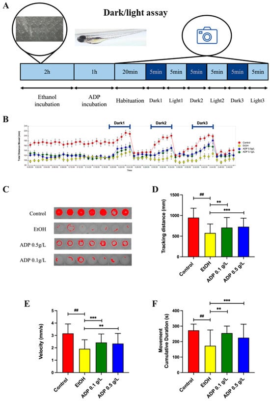 ADP showed an anti-hangover effect in zebrafish larvae. (A) Schematic illustration of the design of the zebrafish dark/light assay. The zebrafish larvae received a 2h treatment of 2% EtOH. Then, the zebrafish larvae were exposed to ADP without 2% EtOH for 1 h. After 1 h, the zebrafish larvae were exposed to 3 alternating dark/light cycles (5 min dark–5 min light). Analysis was performed on the average parameters of the three dark phases. (B) The total moving distance of zebrafish larvae during the analysis period. (C) Representative swimming tracks of zebrafish during one of the dark phases. (D–F) Quantitative analysis of average tracking distance, swimming velocity and cumulative moving duration in the three dark phases. All data are presented as mean ± SD (n = 24). The significance of the difference was compared vs. control at ## p < 0.01 and vs. EtOH at ** p < 0.01 and *** p < 0.001 in (D–F).