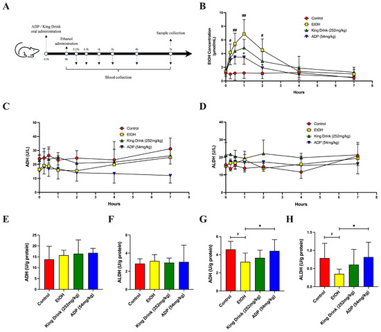 ADP accelerated ethanol elimination after acute ethanol administration. (A) Schematic illustration of the design of ethanol metabolism assay. SD rats received an acute administration of 30% EtOH. ADP and King Drink were pre-administered to respective treatment groups 30 min before EtOH administration. Blood was collected through the tail vein at different time points. (B) Blood ethanol concentration curve following acute intake of EtOH. (C,D) Blood ADH and ALDH activity over the 7 h time course. (E,F) Liver ADH and ALDH activity at 7 h after ethanol administration. (G,H) ADH and ALDH activity in cecum content of animals 7 h after ethanol administration. All data are presented as mean ± SD (n > 8). The significance of the difference in treatment groups was compared vs. control at # p < 0.05; ## p < 0.01; and vs. EtOH at * p < 0.05 in (B,G,H).