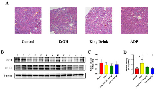 ADP prevented over-activation of HO-1 after acute ethanol administration. (A) Effects of ADP on histopathological changes in liver tissues after acute ethanol administration. Bar = 50 μm. (B) Representative Western blot bands for protein expressions in liver of animals pretreated with ADP and acute ethanol ingestion. C: control; E: EtOH; K: King Drink; and A: ADP group. (C,D) Statistical analysis of Nrf2 and HO-1 protein expression in liver. All data are presented as mean ± SD (n = 3). The significance of difference in treatment group was compared vs. control at # p < 0.05 and vs. EtOH at * p < 0.05 in (D).