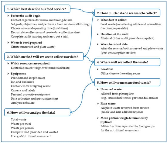 - Cook, N.; Collins, J.; Goodwin, D.; Porter, J. A systematic review of food waste audit methods in hospital foodservices: Development of a consensus pathway food waste audit tool. J. Hum. Nutr. Diet. 2022, 35, 68–80. [Google Scholar] [CrossRef]
