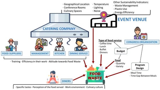 The answers to the questions raised in the Theoretical Basis subsection are as follows. First, Figure 3 has been developed to answer RQ1; it summarizes the key factors that influence the potential food waste originating from an event, since a greater or smaller proportion of the food served is wasted depending on multiple factors and people.