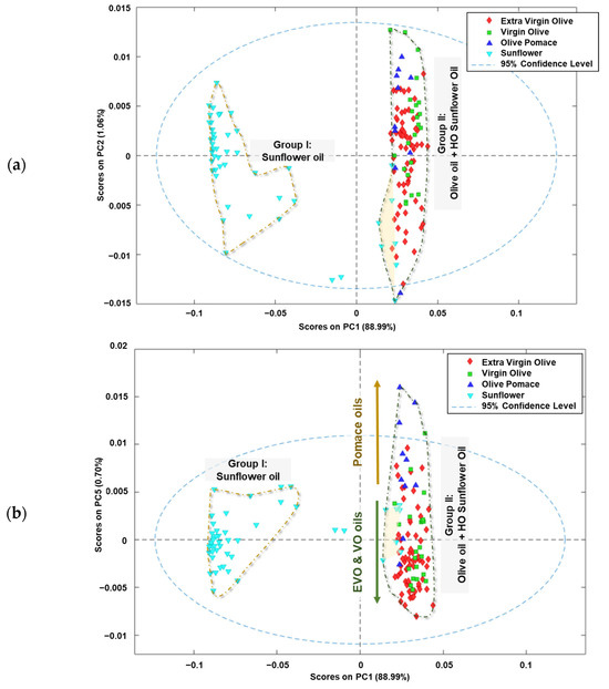 In Figure 3a, the scores received by the analysed oil samples in the first two components (PC2 vs. PC1) are illustrated. The edible vegetable oils are grouped according to the raw material used in the elaboration process, similar to what occurs when HCA is applied. Most of the sunflower oils received negative scores for PC1 (Group I), while the olive oils scored positively for this component (Group II). Additionally, the high oleic sunflower oils included in this group received negative scores for PC2.