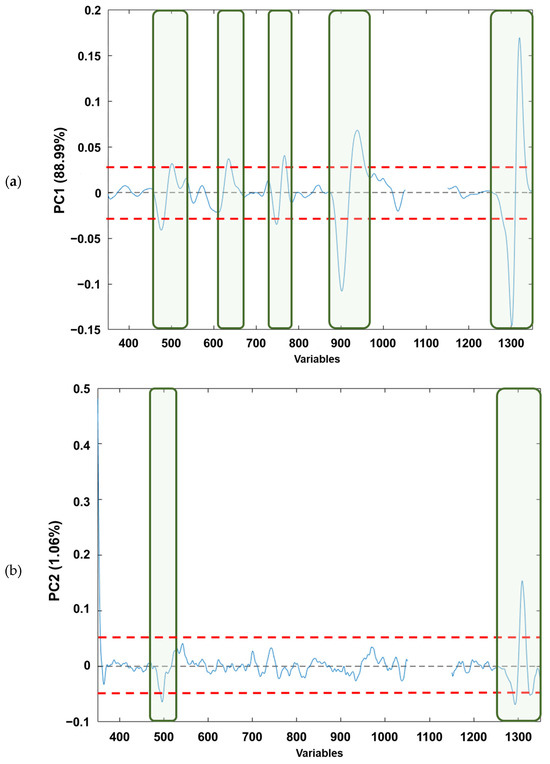 Figure 3b presents a graphical representation of the scores received by the analysed oil samples in the PC5 vs. PC1 space. The distribution of the edible oils’ scores along the PC1 space reveals the same main grouping as the raw material from which the oils are obtained (Group I and II). Additionally, a new tendency is observed in Group II, which can be explained by the oleic acid content. The oils with a high oleic acid content received positive scores on PC5, while the others were in the negative area of this component. In addition, it was observed that higher oleic acid content in the oil samples resulted in higher positive scores on PC1. These trends can be explained by examining the fingerprint regions with minimal variations in total variance, indicating minimal differences between fingerprints.