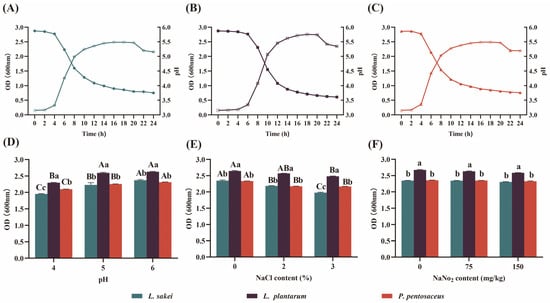 Growth potential of three LAB strains in vitro. Growth activities and acid production capacities of L. sakei (A), L. plantarum (B), and P. pentosaceus (C). Tolerance of LAB at different pH (D), NaCl content (E), and NaNO2 content (F). Different uppercase letters (A–C) mean significant differences among the three different LAB within the same condition (p < 0.05). Different lowercase letters (a–c) mean significant differences among the different conditions of the same LAB (p < 0.05).