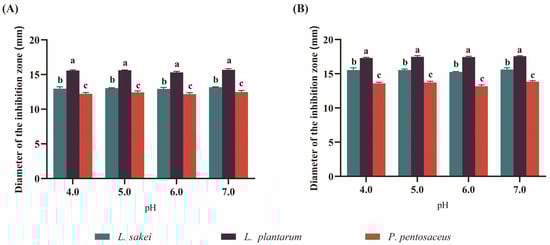 Antibacterial activity of three LAB on E. coli (A) and S. aureus (B) at different pH values. Different lowercase letters (a–c) indicate significant differences among the three different LAB within the same pH condition (p < 0.05).
