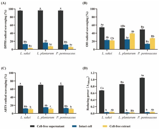 Antioxidant potential of three LAB. (A) 2,2-Diphenyl-1-picrylhydrazyl (DPPH), (B) hydroxyl (OH) radical scavenging activity, (C) 2,2′-azino-bis (3-ethylbenzothiazoline-6-sulfonic acid) (ABTS), and (D) reducing power. Different uppercase letters (A–C) mean significant differences among the three different LAB of the same type (p < 0.05). Different lowercase letters (a–c) mean significant differences among the three different types of the same LAB (p < 0.05).