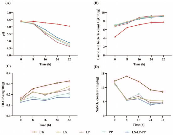 The pH (A), LAB counts (B), TBARS (C), and NaNO2 content (D) during fermentation.