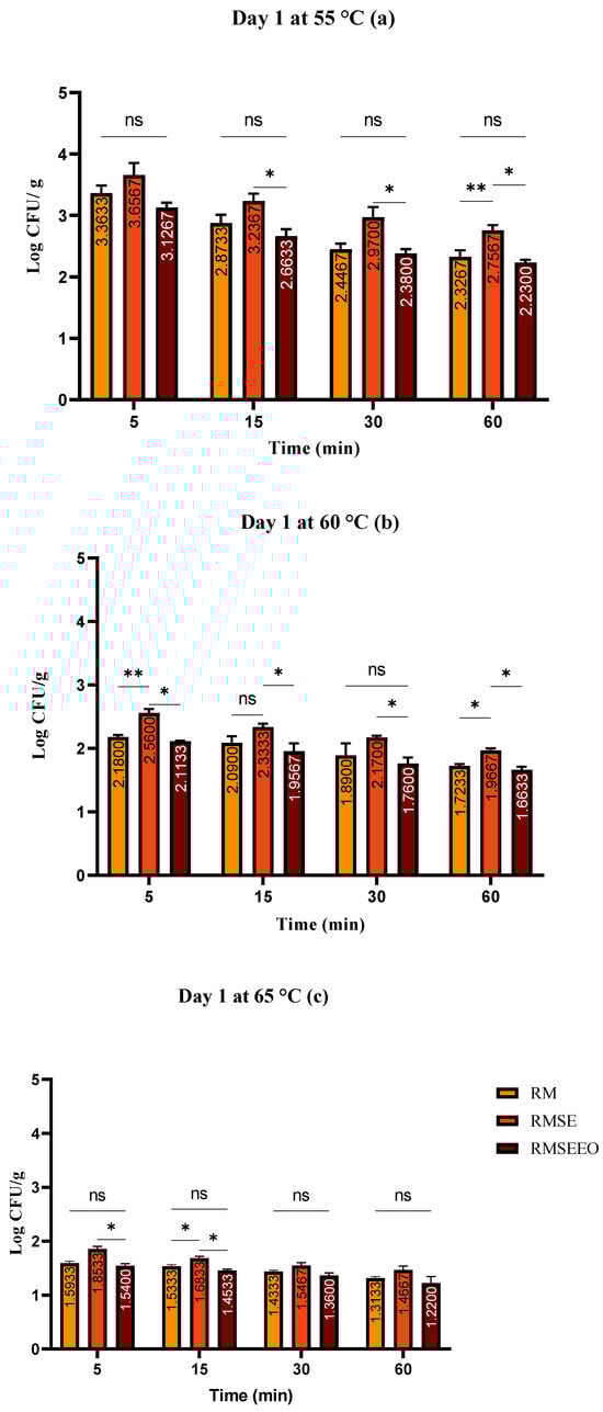 (a–c). Total count of bacteria (log CFU/g) at day 1: Tukey’s multiple comparisons test Groups (RM vs. RMSE, RM vs. RMSEEO, and RMSE vs. RMSEEO), ** p ≤ 0.01, * p ≤ 0.05, ns—not significant.