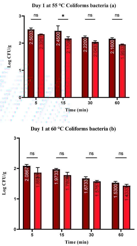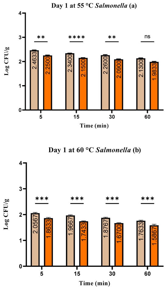 Raw, uncooked rabbit meat was used to prepare the control samples and evaluated on day 0, where a total count of bacteria with a value of 3.17 ± 0.01 log CFU/g and coliform bacteria with a value of zero were found. The effects of wild thyme EO for each heat treatment on day one sous vide rabbit samples are shown in Figure 1a–c. This figure shows the average counts found in samples with or without wild thyme EO over time and consistent with thermal treatment. Overall bacterial counts were higher in samples heated to 55 °C for five minutes. The total number of bacteria in the control groups ranged from 1.31 ± 0.04 to 3.36 ± 0.12 log CFU/g. The highest total bacteria counts were found in S. enterica-treated groups.