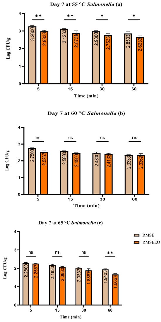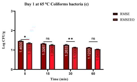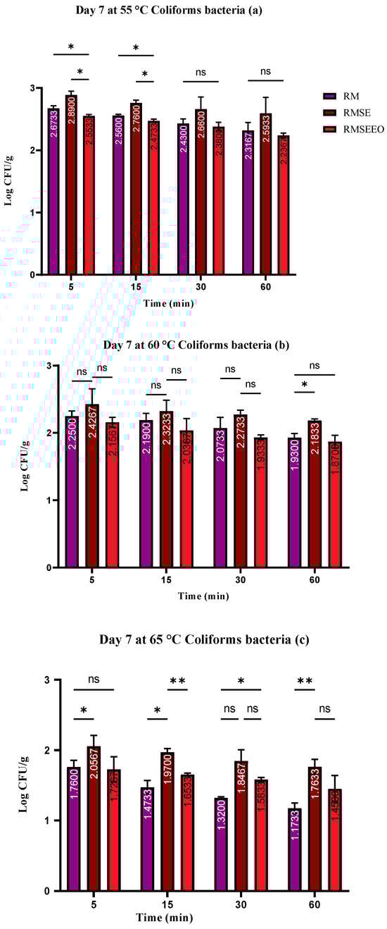 (a–c). Number of coliform bacteria (log CFU/g) at day 7: Tukey’s multiple comparisons test; (RM vs. RMSE, RM vs. RMSEEO, and RMSE vs. RMSEEO). ** p ≤ 0.01, * p ≤ 0.05, ns—not significant.