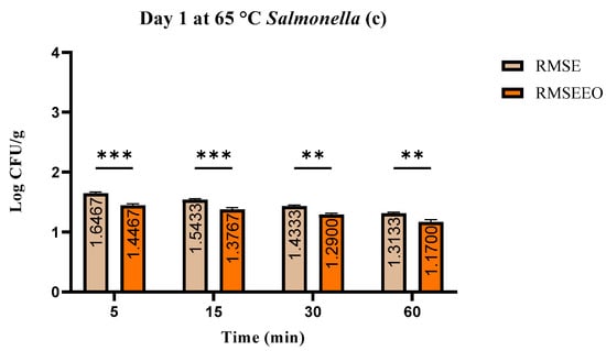 RMSEEO: Fresh rabbit meat was vacuum-packed into polyethylene vacuum cooking bags, treated with 1% wild thyme EO, mixed with S. enterica, and kept at 4 °C before heating to 55–65 °C for 5 to 60 min.