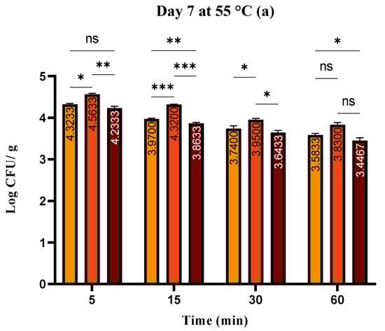On days 1 and 7, microbiological analyses were performed. Before heating, samples were stored at a temperature of 4 °C for 24 h, and after heating, half of the samples were evaluated after 7 days. A quantity of 5 g of meat samples was weighed and thereafter placed in an aseptic stomacher bag. After that, 45 mL of peptone water was used to dilute the samples to 10−1, and a stomacher was used to homogenize them for two minutes. Then, 0.1 mL of an aliquot from an appropriate dilution was pipetted and spread on standard pre-dried plate count agar media. These microbial species were evaluated: to grow coliform bacteria (CB) the Violet Red Bile Lactose Agar (VRBL; Oxoid, Basingstoke, UK) incubated at 37 °C for 24 for 48 h, was used. To grow total viable counts (TVC), Plate Count Agar (PCA; Oxoid, Basingstoke, UK), incubated at 30 °C for 48–72 h, was used. The 24 to 48 h incubation period was carried out on Xylose Lysine Deoxycholate Agar (XLD; Oxoid, Basingstoke, UK) for the Salmonella spp. growth. After incubation and enumeration from each plate, 8 different colonies on Tryptone Soya agar (TSA; Oxoid, Basingstoke, UK) were reinoculated and incubated for 30 °C. The methods were previously described by Gál et al. [25].