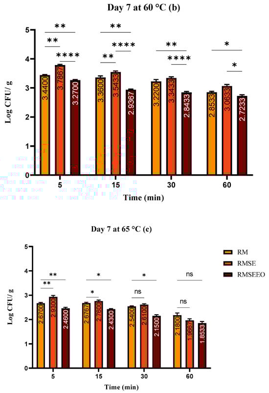 (a–c). Total count of bacteria (log CFU/g) at day 7: Tukey’s multiple comparisons test, Groups (RM vs. RMSE, RM vs. RMSEEO, and RMSE vs. RMSEEO). **** p ≤ 0.0001, *** p ≤ 0.001, ** p ≤ 0.01, * p ≤ 0.05, ns—not significant.
