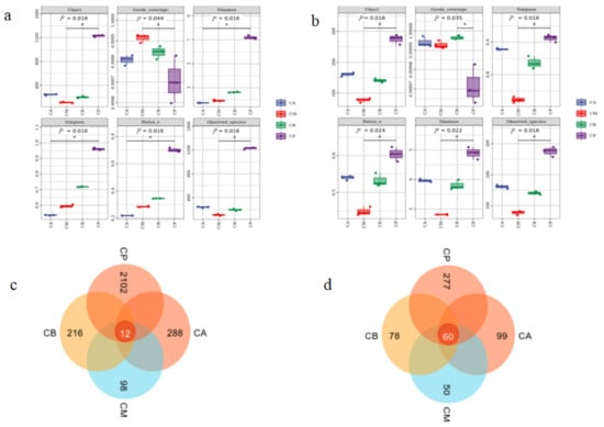 Following meticulous quality control filtration, the FG samples (CA, CM, and CB) and PM (CP) yielded bacterial sequences numbering 124, 138–168, and 166, respectively. These sequences exhibited an average length spanning from 137 to 338 base pairs. Emanating from this, a cumulative total of 2912 bacterial operational taxonomic units (OTUs) were engendered via cluster analysis. Simultaneously, the fungal sequences numbered between 111,765 and 128,262, characterized by an average length ranging from 195 to 434 base pairs. Notably, this culminated in the generation of 698 fungal OTUs through cluster analysis. The extensive coverage of samples within each grouping surpassed the threshold of 0.999, complemented by a calculated p value of 0.016 for the Chao1 index (Figure 1a,b). Robust validations from the dilution curve, Shannon curve, and alpha diversity collectively affirm the representative nature of the acquired sequencing data of the samples (Figure 1 and Figure S2). Furthermore, the focal point of our analysis honed in on the predominant microbial species found within FG and PM, facilitated through the utilization of a clone library approach.