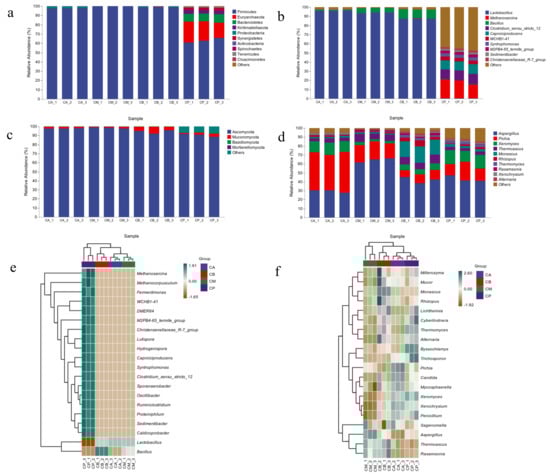 In the hierarchical clustering diagram shown in Figure 4c,d, the FG samples (CA, CM, and CB) were similar in bacterial diversity, and the three bacterial genera with high relative abundances were Lactobacillus, Methanosarcina, and Bacillus. Similarly, the PM, CA, and CB samples had similar fungal diversity, and the three fungal genera with high relative abundances were Aspergillus, Pichia, and Xeromyces.