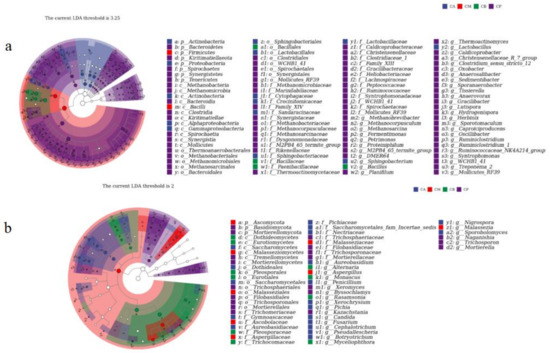 LEfSe analysis of fermented grains (FG) and pit-mud (PM): (a) LEfSe analysis of differential species annotated clade of bacteria, (b) LEfSe analysis of differential species annotated clade of fungi.