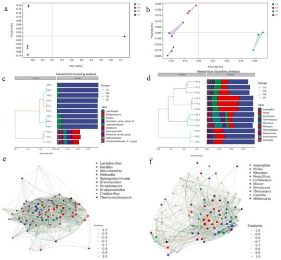 Principal component analysis (PCA), hierarchical clustering analysis and network correlation analysis of bacteria and fungi at the genus level: (a) PCA of bacteria, (b) PCA of fungi, (c) Hierarchical clustering of bacteria, (d) Hierarchical clustering of fungi, (e) Network correlation analysis of bacteria, and (f) Network correlation analysis of fungi.