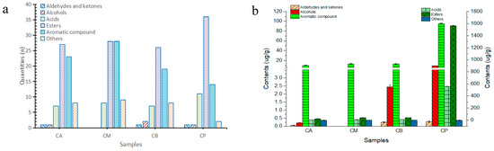 A total of 73 volatile components were detected within FG (including the internal standard). Among these, 14 substances took center stage as the principal volatile components, encompassing ethyl hexanoate, ethyl octanoate, and caproic acid (Tables S1 and S2). In tandem, PM exhibited the presence of 65 volatile components, including caproic acid, acetic acid, and ethyl caproate (Tables S1 and S2). Significantly, the concentrations of acids and esters within PM surpassed those evident in the diverse FG samples. Among these, 26 volatile components were common to both FG and PM samples, whereas 54 volatile components were shared among distinct FG samples. However, it’s noteworthy that the CB and PM samples presented 32 shared volatile components, signifying the influence of FG components from the lower strata of the fermentation cellar on the volatile makeup of PM. The volume and composition of volatile components within PM emerged as the most prominent among the quartet of sample types, with CB boasting the highest alcohol content among the three FG samples (Figure 5a,b).