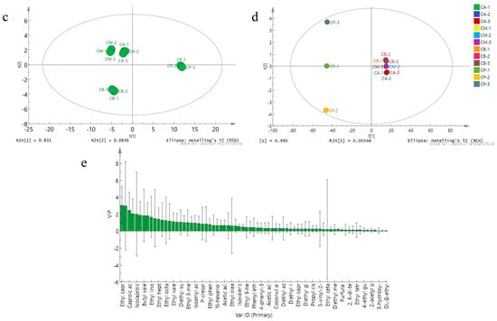 The cumulative contribution rate of corresponding features within the first two principal components reached 91.5%, as depicted in Figure 5c. This value aptly encapsulates a substantial portion of the pertinent flavor-related information. Moving to Figure 5d, the cumulative contribution rate of corresponding features in the first two principal components soared to 99.6%, affirming the model’s capability to accurately reflect a remarkable 99.6% alteration in the dataset. Furthermore, all samples resided comfortably within the 95% confidence interval of Hotelling’s T2, an affirmation of the model’s stability, dependability, and its capacity to adeptly distinguish between distinct volatile components across varied samples. The application of partial least squares discriminant analysis (PLS-DA) unveiled that FG samples clustered within specific regions (Figure 5d), a pattern divergent from that observed for PM samples. This contrast implies discernible dissimilarities between the volatile components present in each FG and PM sample.