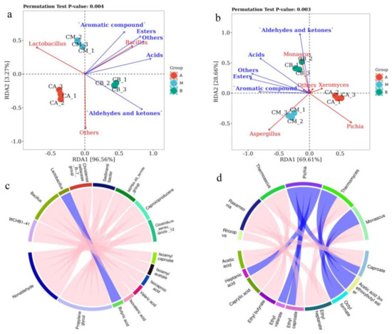 RDA analysis and correlation perfume Circos of dominant microorganisms at genus level in fermented grains (FG): (a) RDA analysis of volatile components and bacterial genera; (b) RDA analysis of volatile components and fungal genera; (c) correlation of perfume Circos of bacteria with volatile components; (d) correlation of perfume Circos of fungi with volatile components.