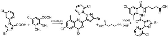 Hapten was conjugated by previously reported procedures with some modifications [22]. The process is depicted in Figure 1. In brief, 0.01 mol of 3-bromo-1-(3-chloropyridin-2-yl)-1hydro-pyrazole-5-carboxylic acid was dissolved in 30 mL of acetonitrile, and then 1.22 mL of CH3SO2Cl and 2.7 mL of pyridine were added dropwise into acetonitrile in turn. After 10 min of incubation at room temperature, 0.015 mol of 2-amino-3-methyl-5-chlorobenzoic acid and 2.7 mL of pyridine were added to the above mixture and stirred for 15 min. A total of 1.22 mL of CH3SO2Cl was added and stirred at room temperature. The end of the reaction was detected by thin-layer chromatography. After adding 17 g of water, the mixture was filtered and recrystallized using ethanol to obtain the compound 2-[3-bromo-1-(3-chloro-2-pyridinyl)-1H-5-pyrazol]-6-chloro-8-methyl-4H-benzo[d]. A total of 0.26 mmol of aminobutyric acid and 0.45 mmol of NaOH were added to 5 mL of anhydrous DMF in a 25 mL round-bottomed flask and stirred at 25 °C for 1 h. Then, 0.22 mmol of 2-[3-bromo-1-(3-chloro-2-pyridinyl)-1H-5-pyrazol]-6-chloro-8-methyl-4H-benzo[d] [1,3] oxazin-4-one was added. After stirring for 12 h, the solution was mixed with 15 mL of water, adjusted to a pH of 3 using concentrated hydrochloric acid, and then extracted three times with 5 mL of ethyl acetate. Anhydrous sodium sulfate was used to dry the mixture. Recrystallization with hexane and ethyl acetate (3:1, v/v) produced 80 mg of CAP hapten in 64.7% yield, which was characterized by high-resolution mass spectrometry (HRMS) and nuclear magnetic resonance hydrogen spectroscopy (1H NMR).
