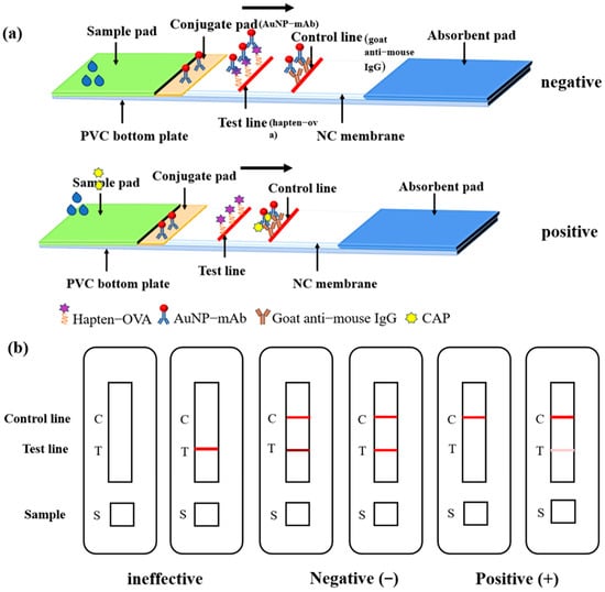Schematic diagrams of the AuNP-LFIA. (a) The binding between the AuNP-labeled mAb and hapten-OVA would generate a red color on the T line for the negative sample, which would be inhibited by CAP in positive samples. (b) Result judgment of the AuNP-LFIA.