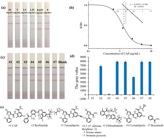 (a) the sensitivity of the AuNP-LFIA for CAP. (b) Standard curve of the intensity of the T line versus CAP concentration. (c,d) Visual detection results and quantification of CAP and its structural analogs (1000 ng/mL) by the AuNP-LFIA. (e) Structural formulas of CAP and its analogs.