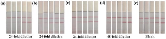 Images of the AuNP-LFIA for CAP detection in different sample matrices with dilution, including brown rice (a), apple (b), soil (c), Chinese cabbage (d), and a blank (working buffer) (e). (CAP concentrations from left to right were 5, 2.5, 1.25, 0.625, and 0 ng/mL, respectively).