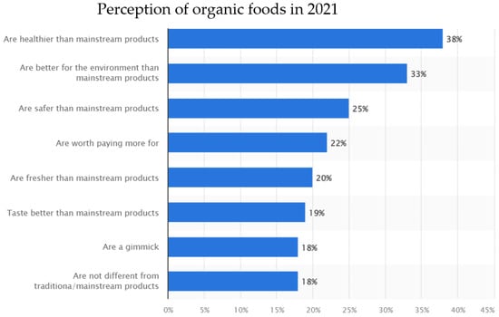 Considering affordability and perceived value majorly influence purchasing decisions, higher income levels often correlate with an increased likelihood of purchasing organic foods [,,]. In addition, higher levels of education are associated with greater awareness of health and environmental concerns related to food choices []. Educated consumers may be more informed about the benefits of organic farming practices and choose organic products accordingly. A recent study investigating the organic purchasing intentions of Bangladeshi consumers uncovered a significant positive correlation between the level of education and the intention to purchase sustainable organic food. Specifically, the study found a 3.27-fold increase in organic food purchasing among consumers with higher levels of education []. Other socio-economic factors that may influence organic purchasing decisions include age and gender, cultural dietary habits and health and wellness trends in the market [,,,,,,,]. For example, the same study demonstrated that Hungarians and Swiss people over the age of fifty are more price sensitive []. In addition, some cultural or ethnic groups may have traditions or preferences for specific types of organic produce or traditional farming methods, such that individuals with specific health concerns or dietary preferences may opt for organic options. Finally, growing health consciousness and a focus on wellness can drive the demand for organic foods perceived as healthier and free from synthetic chemicals [,,]. Figure 1, taken from Statista 2021 [], further breaks down the surveyed consumers’ attitudes toward organic products and provides further insights into how organic food is perceived in Canada.