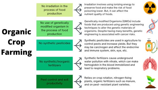 The production of organic food requires special considerations (Figure 2). Generally, organic farming is solely grounded in biological and ecological processes that mitigate the environmental impact of agricultural practices while preserving the natural qualities of food [,]. In this holistic approach, pest and disease control are achieved naturally, eliminating the need for synthetic chemicals utilized in conventional farming [,]. Additionally, organic food must not be sourced from genetically modified organisms (GMOs) [,]. Organic farming also relies on mechanical weeding as an alternative to traditional herbicide input, potentially leading to increased weed cover that benefits various organisms by promoting biodiversity []. Core principles of organic agriculture, such as the use of green manure, crop diversification, and small fields, further contribute to the production system’s sustainability []. Following these principles, organic farming is believed to enhance soil fertility and foster biodiversity. Studies indicate that local species richness and abundance can increase by approximately 34% and 50%, respectively, across various crops worldwide compared to conventional farming practices []. Thus, there has been a recent upsurge in both the production and purchasing of organic goods, driven by a heightened demand for natural products that undergo minimal processing and abstain from synthetic and artificial fertilizers or pesticides in their production processes [,].