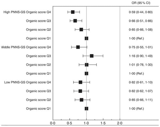 The prospective association between the organic score in quartiles (Q) and the risk of obesity, represented as % BMI change from the first quartile (Q1, baseline = 1.0). Organic scores are stratified according to diet nutritional quality and based on a low, middle, or high Programme National Nutrition Santé guidelines score (PNNS-GS). Values are OR and 95% CI, adjusted for age, sex, month and year of inclusion, delay in follow-up, occupation, marital status, education, monthly income per unit, dietary supplement use, modified Programme National Nutrition Santé guidelines score (mPNNS-GS), principal-component-analysis-extracted dietary patterns scores, energy intake, physical activity, tobacco status and history of chronic diseases. Ref. = referent values. Taken from Kesse-Guyot et al. (2017) [].