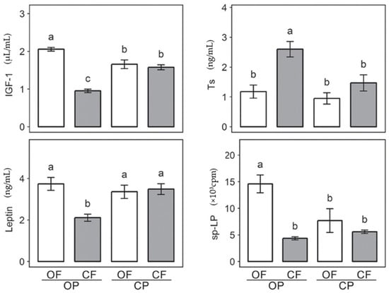 The effects of organic and conventional crop production on four physiological parameters in rats. Plasma concentrations of insulin-like growth factor 1 (IGF-1), testosterone (Ts), leptin and spontaneous lymphocyte proliferation (sp-LP) were measured in 24 Wistar rats after 12 weeks (n = 24). Feeds were composed of crops produced from different organic and conventional regimes (OF = organic fertilization, CF = conventional fertilization, OP = organic crop protection, CP = conventional crop protection). Different letters above bar indicate significant difference (p < 0.05) as determined by Tukey’s HSD test (a vs. b vs. c). Taken from Baranski et al. (2017) [], adapted from Srednicka-Tober D et al. (2013) [].