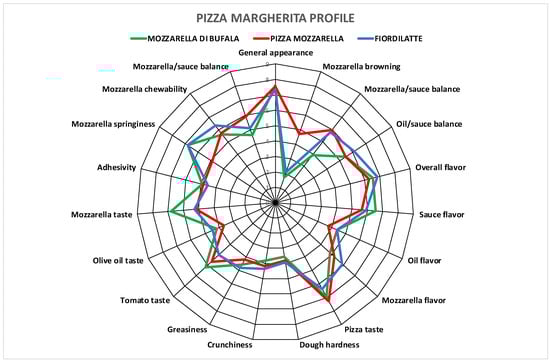 The main descriptors (with higher scores) were found to be general appearance, overall flavor, sauce flavor and pizza taste. Surprisingly, the results of the descriptive sensory analysis performed did not show significant differences among samples in most descriptors, with the exception of mozzarella browning, which was more intense in Pizza mozzarella, and mozzarella/tomato sauce balance descriptor, which was lower in Mozzarella di Bufala.