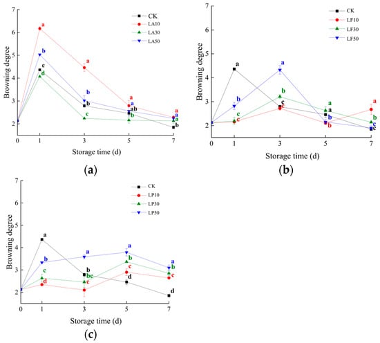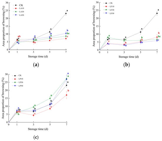 Area proportion of browning (APB) of the FCSPSs after different treatments during storage. (a) APB of CK and three LA treatments; (b) APB of CK and three LF treatments; (c) APB of CK and three LP treatments. Note: Values within the same storage day followed by the different letters are significantly different at the 5% level according to ANOVA–Duncan’s multiple range test.