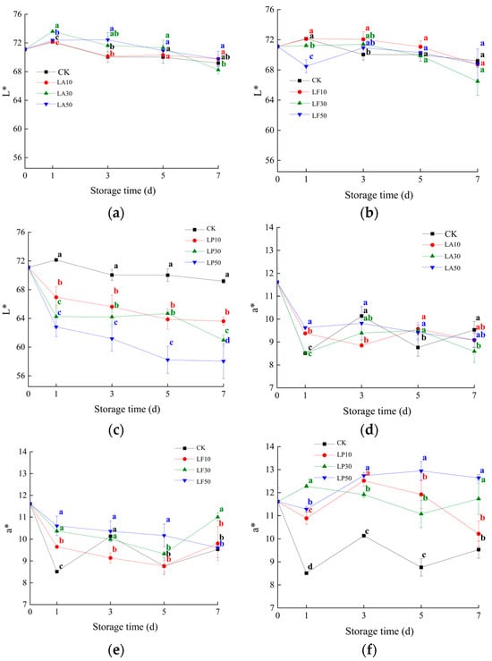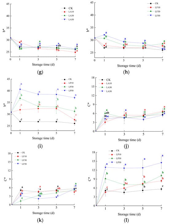 Chromatic coordinates of the FCSPSs after different treatments during storage. (a) L* value of CK and three LA treatments; (b) L* value of CK and three LF treatments; (c) L* value of CK and three LP treatments; (d) a* value of CK and three LA treatments; (e) a* value of three LF treatments; (f) a* value of CK and three LP treatments; (g) b* value of CK and three LA treatments; (h) b* value of CK and three LF treatments; (i) b* value of CK and three LP treatments; (j) C* value of CK and three LA treatments; (k) C* value of CK and three LF treatments; and (l) C* value of CK and three LP treatments. Note: Values within the same storage day followed by the different letters are significantly different at the 5% level according to ANOVA–Duncan’s multiple range test.