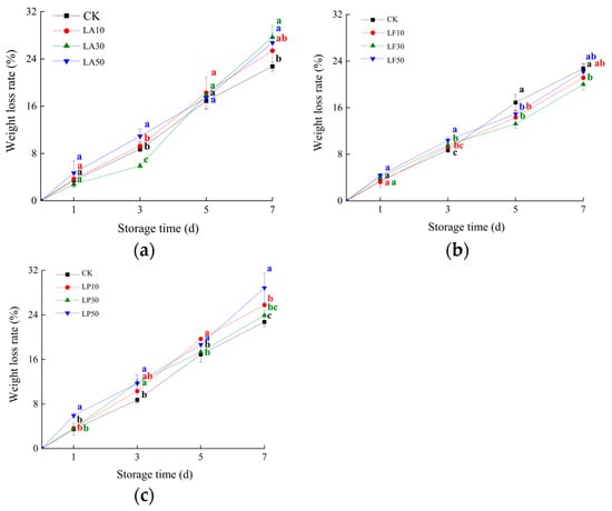 Weight loss rate of FCSPSs after licorice extract solution treatments during storage. (a) CK and 3 LA treatments; (b) CK and 3 LF treatments; and (c) CK and 3 LP treatments. Note: Values within the same storage day followed by the different letters are significantly different at the 5% level according to ANOVA–Duncan’s multiple range test.