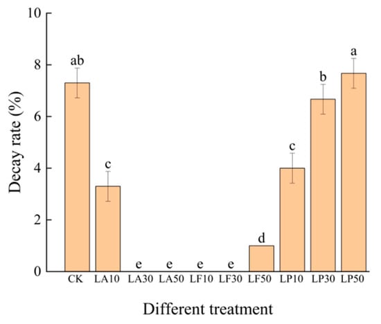 The change in the decay rate (DR) of the FCSPSs at 7 DAS, as Figure 5 shows, the DR of the FCSPSs with all treatments was 0.0% until 5 DAS. As shown in Figure 5, the DR of the FCSPSs with CK was 7.33%. The DR of LA30, LA50, LF10, and LF30 was 0.00%. The DR of LA10 and LF50 was 3.33% and 1.00 %, respectively. They were significantly different from CK (p < 0.05). It indicates that moderate LA and LF solutions can effectively inhibit the decay issue in a week. The DR of LP30 and LP50 was not significantly different from CK (p > 0.05); it was 6.67% and 7.67%, respectively. However, the DR of LP10 was significantly lower than CK (3.67%, p < 0.05). LP may be less or not effective in preventing decay processing on FCSPSs in a week.