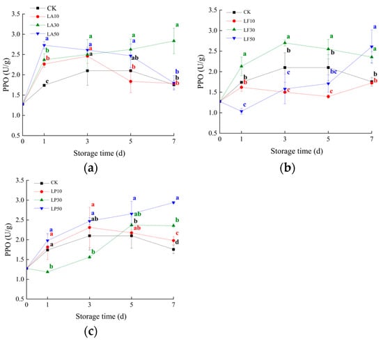 Polyphenol oxidase activities (PPO) activities of the slices of licorice extract solution treatments during storage (a) CK and three LA treatments; (b) CK and three LF treatments; and (c) CK and three LP treatments. Values within the same storage day followed by the same letter are not significantly different at the 5% level according to ANOVA–Duncan’s multiple range test.