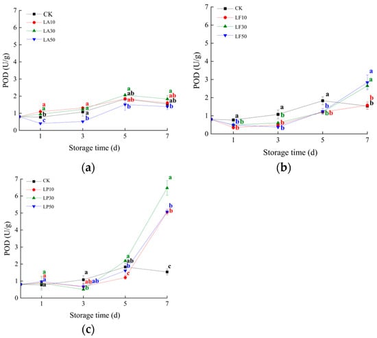Peroxidase (POD) activities of the slices of licorice extract solution treatments during storage. (a) Three licorice acid treatments; (b) three licorice flavonoid treatments; (c) three licorice polysaccharide treatments. Note: Values within the same storage day followed by the different letters are significantly different at the 5% level according to ANOVA–Duncan’s multiple range test.