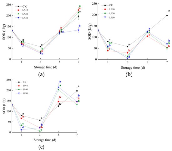 Superoxide dismutase (SOD) activities of the slices of licorice extract solution treatments during storage. (a) Three licorice acid treatments; (b) three licorice flavonoids treatments; and (c) three licorice polysaccharides treatments. Note: Values within the same storage day followed by the different letters are significantly different at the 5% level according to ANOVA–Duncan’s multiple range test.