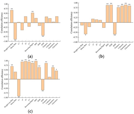 The correlation efficiency of solution concentration to physical and chemical properties of slices at 7 DAS (n = 40). (a) LA; (b) LF; (c) LP. Note: * means significant correlation at the 5% level and ** means significant correlation at the 1% level.