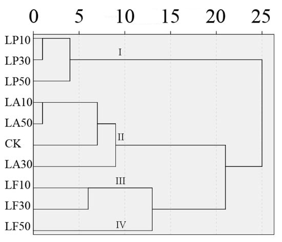 Cluster analysis of FCSPSs quality traits by 10 treatments at 7 DAS. Note: A Euclidean distance of 10 was used to classify the groups.