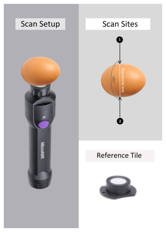 The NIR spectra of the intact egg samples were collected at two points of the equatorial line of the egg separated by 180°. This was achieved by using a portable NIR spectrophotometer (Micro-NIR 1700, Viavi, Milpitas, CA, USA) working in the 950–1600 nm wavelength range, with a spectral resolution of 10 nm with no moving parts (Viavi Solutions, 2015, Milipitas, CA, USA) [29]. The MicroNIR software was used to control the instrument and collect the spectra (MicroNIR Prov 3.1, Viavi, Milpitas, CA, USA). The parameters for spectral data acquisition were configured with an integration time of 50 ms and an average of 50 scans (MicroNIR Prov 3.1, Viavi, Milpitas, CA, USA). To calculate absorbance/reflectance, reference spectra of a Spectralon® were collected every 20 samples [29]. Figure 1 shows the set-up utilized to collect the NIR spectra of the egg samples analyzed.