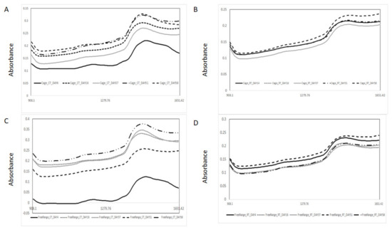 Figure 2 shows the raw mean NIR spectra of the egg samples analyzed in each storage time condition and different production systems. Figure 3A–D shows the second derivative NIR mean spectra of samples stored at RT and CT (Panel A: RT and cage, Panel B: CT and cage, Panel C: RT and free range and Panel D: CT and free-range). Two main features were observed in the second derivative NIR spectra around 1170 nm and 1440 nm, associated with C–H and O–H stretching bonds, respectively [38,39,40]. The absorbance around 1170 nm (between 1160 to 1180 nm) might be associated with C–H and C–H3 bonds [38,39,40]. This region can be associated with the absorption of fatty acids containing cis double bonds (second overtones C–H) as reported by Sato and collaborators (1991) [29,41]. However, the main differences in the NIR spectra of the egg samples collected from the different days and storage treatments were observed around 1440 nm (O–H bonds). This wavelength may be associated with the loss of water through the shell during storage, as well as the moisture content within the egg, as reported by other authors [17,18]. Other authors also indicated that the absorbance around 1450 nm might be associated with the first overtone of O–H stretching bonds. An increase in the absorbance values at this wavelength might be directly related to changes in protein structure during egg storage [22,29]. A recent study by Chen and co-workers [42] stated that the wavelength region between 1400 and 1500 nm might also be associated with the presence of N–H secondary bonds corresponding to amine groups [42]. They further indicated that the NIR spectra of whole eggs are derived from the overlapping of signals of various egg constituents (e.g., protein, lipids) [29,42]. This overlapping contributes to the spectral differences observed among the different types of eggs (e.g., cage vs. free-range; storage temperature). However, it is important to note that most of these spectral characteristics can be considered as being less prominent [42]. In this study, subtle changes were observed around this wavelength. These were not only in the absorbance value itself but also a shift on the absorbance of this wavelength towards higher wavelengths. This shift was dependent on the storage conditions (CT vs. RT) and the production system (cage vs. free-range). However, no clear trend can be definitively linked to either number of storage days or storage conditions (CT vs. RT).