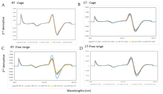 Second derivative mean (21 smoothing points; second polynomial order) near-infrared spectra of egg samples from cold (CT) and room (RT) temperature storage conditions and production systems (cage and free-range) analyzed using near-infrared spectroscopy. (A) RT and cage, (B) CT and cage, (C) RT and free range and (D) CT and free-range.