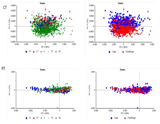 The PCA scores plot of the whole egg samples from the storage conditions (CT and RT) are shown in Figure 4. The first three PCA components from the CT treatment explained 98% of the variance, while for egg samples from the RT treatment 97% of the variance was explained. In the case of egg samples from the CT treatment, plotting PC1 (90%) vs. PC3 (2%) shows a separation between cage and free-range egg samples. However, no trends or patterns were observed in the case of the eggs obtained from the RT treatment.