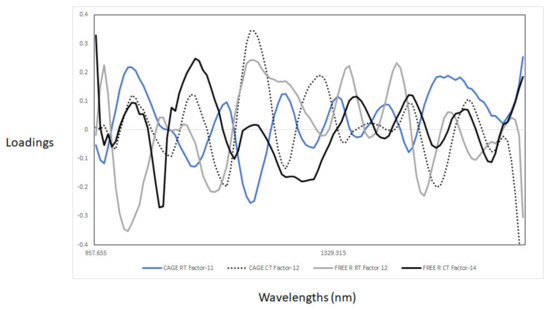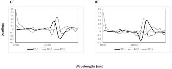 The PCA loadings were also different for each of the PCA models (Figure 5). The bands around 1193 nm (C–H and C–H3 bonds), 1397 nm (C–H combinations and C–H2 bonds) and 1508 nm (N–H) play a crucial role in explaining the differences observed in the PCA score plots [38,39,40]. The separation between the cage and free-range egg samples under CT storage was explained by wavelengths around 1140 nm (C–H and C–H3 bonds) which is associated with aromatic groups as well as fatty acids containing cis double bonds [41,43], around 1354 nm (C–H combination bonds) and around 1428 nm (O–H bonds) associated with moisture and proteins (Figure 5, CT) [38,39,40,43]. Although no clear separation between cage and free-range egg samples under RT storage was observed, the highest loadings were observed at similar wavelengths as reported in the previous section (Figure 5, RT).