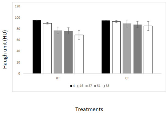 Changes in the Haugh units (HU) (freshness) in the egg samples from cold (CT) and room (RT) temperature storage conditions.