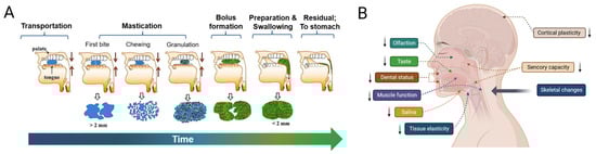 (A) The whole process of oral food processing and swallowing. (B) Several important risk factors are associated with dysphagia in the older population. Notably, ↓ indicates decreased function.